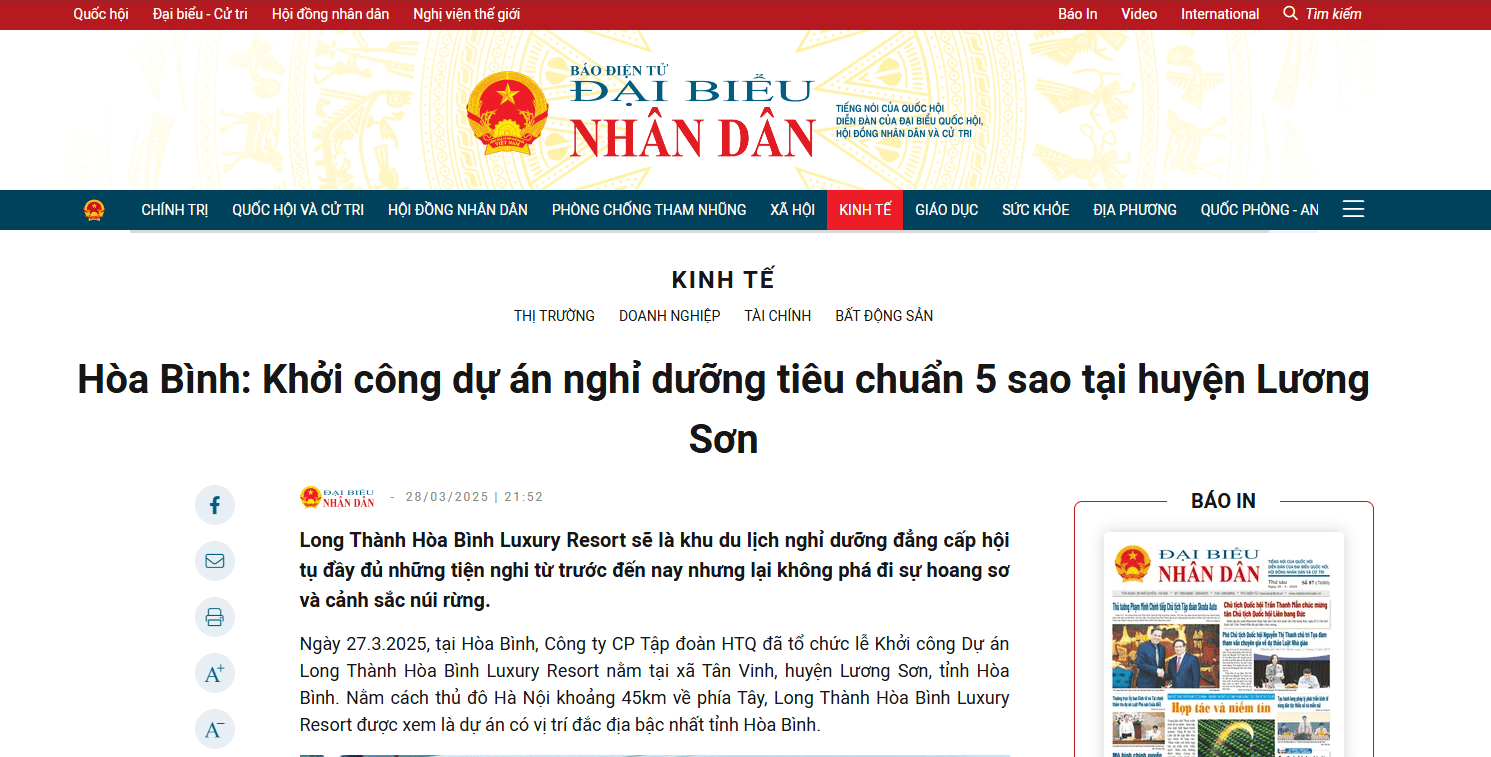 BÁO ĐẠI BIỂU NHÂN DÂN: Khởi công dự án tiêu chuẩn 5 sao tại huyện Lương Sơn, Hòa Bình